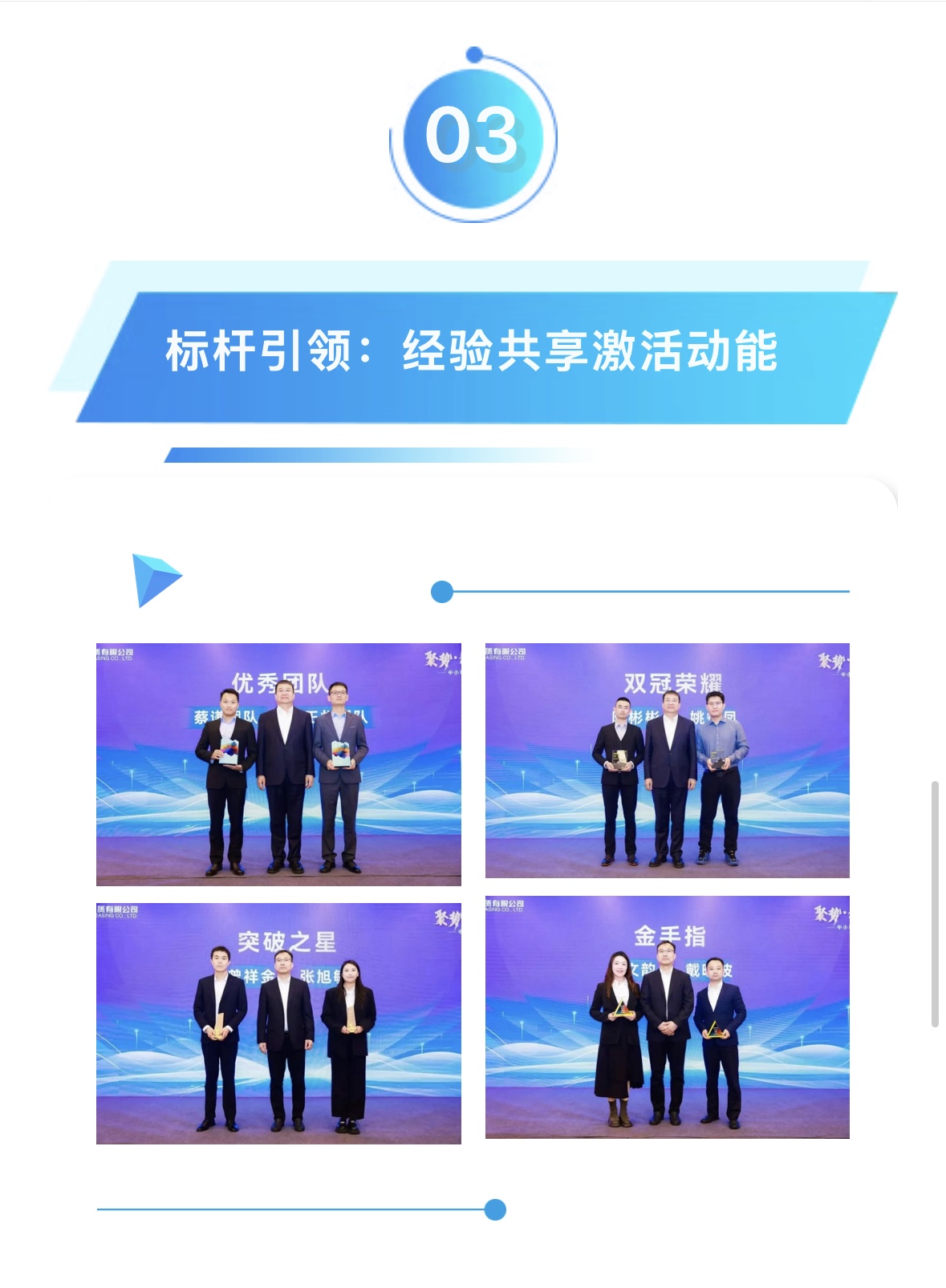 在榮譽時刻環(huán)節(jié),21位優(yōu)秀員工依次登臺,接受屬于他們的榮耀時刻。通過優(yōu)中選優(yōu),團隊推出由6位業(yè)務(wù)精英,登臺分享業(yè)務(wù)破局密碼,內(nèi)容涵蓋客戶談判策略、優(yōu)秀團隊經(jīng)營理念、渠道建設(shè)經(jīng)驗等……現(xiàn)場伙伴受益匪淺。